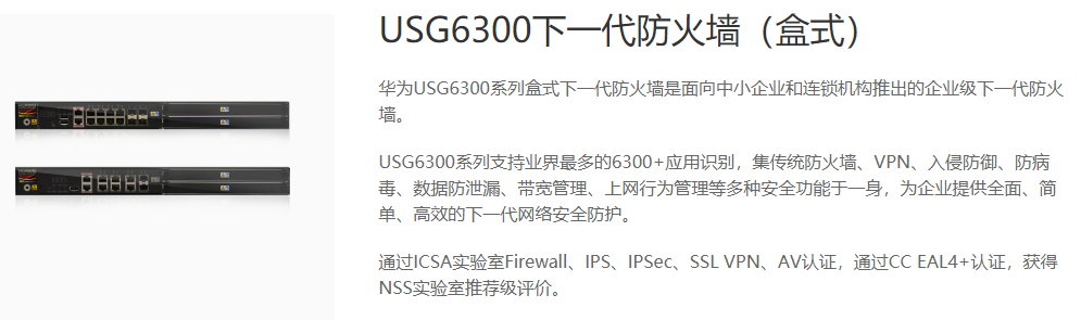 華爲USG6300系列下一代防火(huǒ)牆面向中小(xiǎo)企業(yè),通過對應用(yòng)、用(yòng)戶、内容、威脅、時間、位置6個(gè)維度的(de)全面感知,提供精細的(de)業(yè)務訪問控制(zhì)和(hé)加速。入侵防禦(IPS)和(hé)防病毒(AV)等應用(yòng)層深度防禦與應用(yòng)識别相(xiàng)結合,有(yǒu)效提高(gāo)了威脅防禦的(de)效率和(hé)準确性。具備全面的(de)防護功能(néng),一機多能(néng),有(yǒu)效降低管理(lǐ)成本。精細的(de)帶寬管理(lǐ)和(hé)QoS優化能(néng)力有(yǒu)效降低企業(yè)的(de)帶寬租用(yòng)費,确保關鍵業(yè)務體驗。持續、簡單、高(gāo)效地(dì)提供下一代網絡安全。